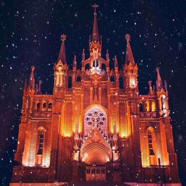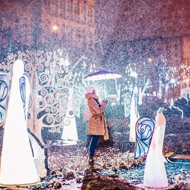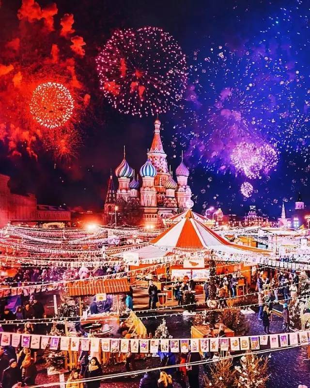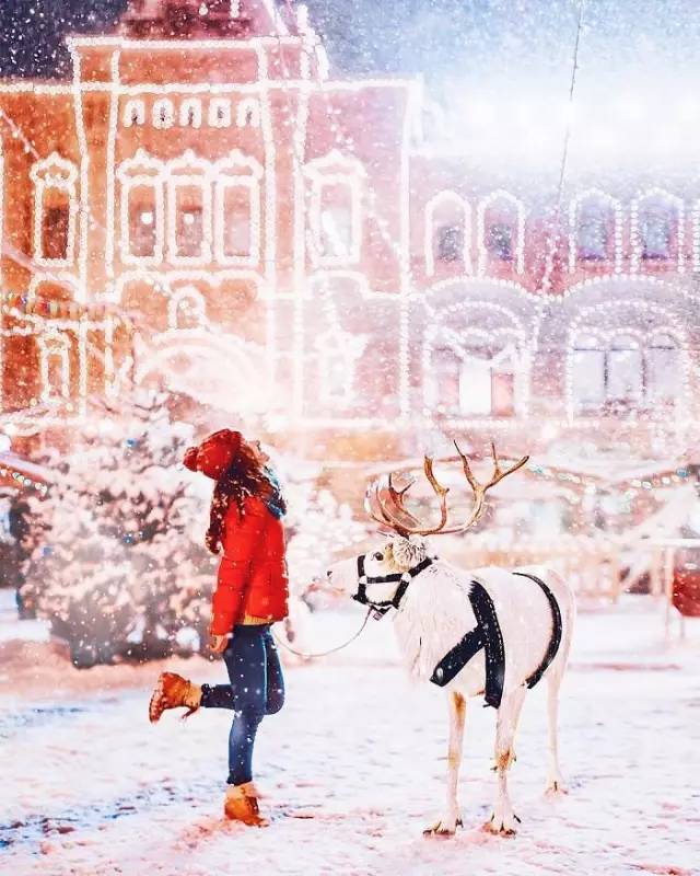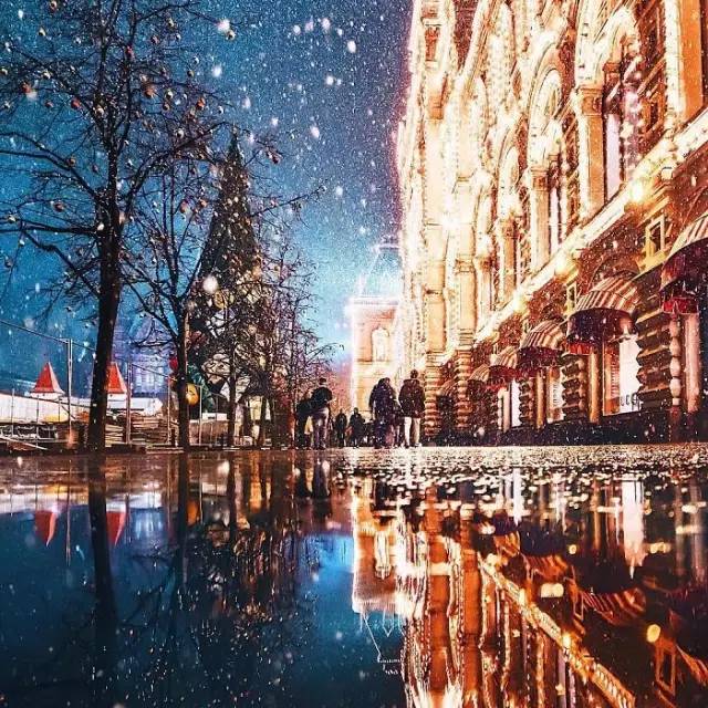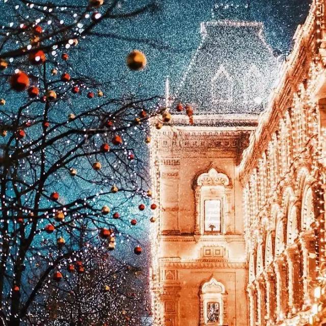 在寒冷刺骨的莫斯科红场,在那湛蓝的夜幕、漫天飞舞的雪中,种类繁多的圣诞灯饰,和色彩斑斓的建筑相映成趣。