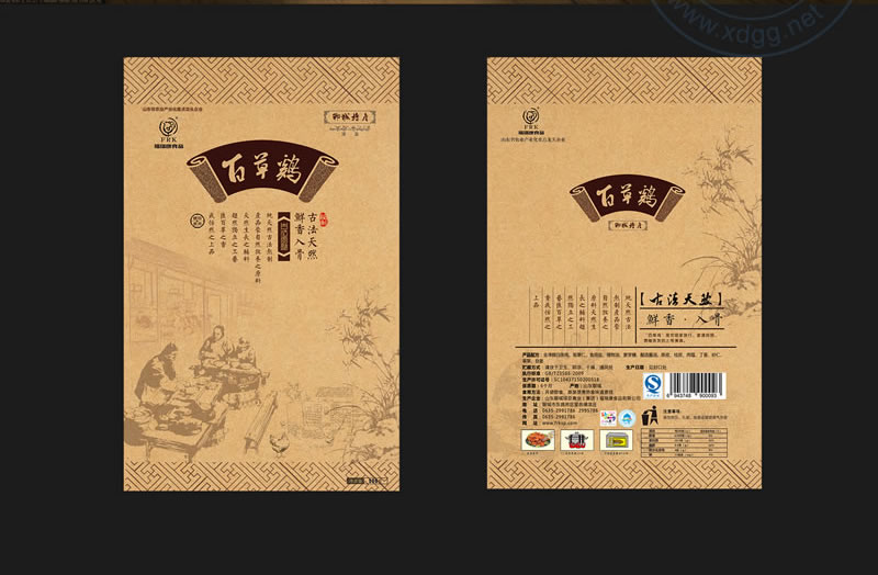 这款百草鸡设计图采取了古色古香的韵味,这种做旧的颜色,具有淳朴浓厚的历史悠久感,给观者代入一种工艺传承感,古朴的底色,特殊的字体,古时人们制作烧鸡的缩略图,再配上几棵清新高洁的竹子,堪称完美!