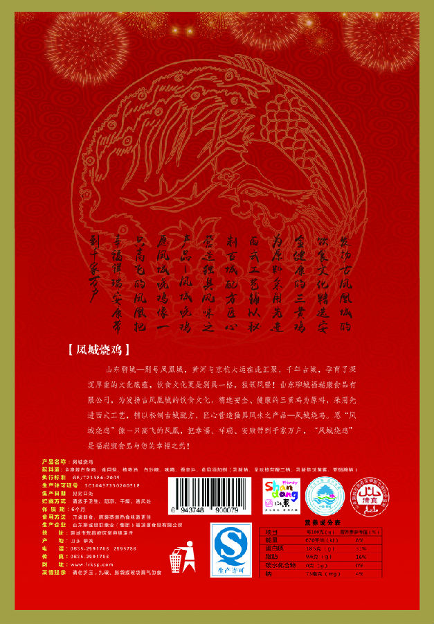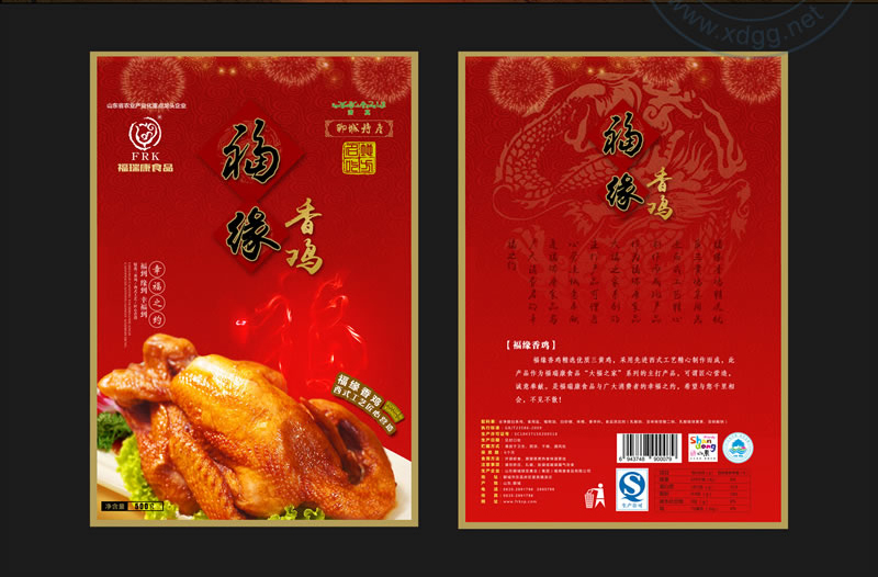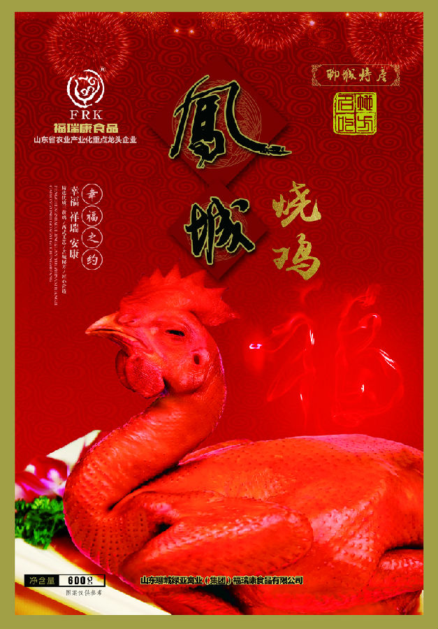凤城烧鸡和福缘香鸡一样用的是一种红红火火的背景色,独有的中国红和代表中国特色的底纹,寓意了喜庆祥和。红底黑字,显得“凤城”更加醒目,烧鸡昂首挺胸,代表了现在生活的红火,蒸蒸日上,这款鸡的设计非常符合大众对于美好生活的向往。