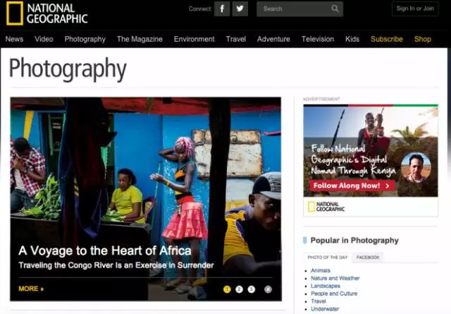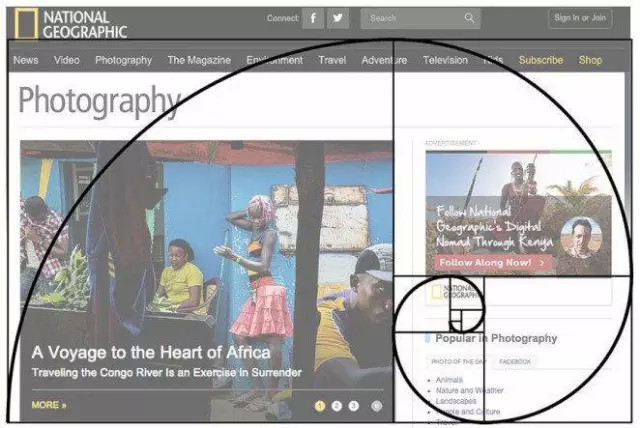 再来看国家地理网站,你会发现在曲线的中心存在着第二个、小一点的logo。这是一个加倍提高品牌形象的好地方,因为这里很自然地吸引了我们的注意力。是潜意识的吗?也许吧。黄金比例可以让一切看起来那样自然。