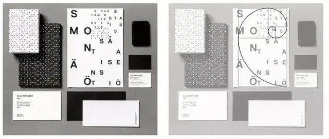 在这个为 Saastamoisen saatio 所做的视觉识别系统中,随着黄金螺旋的不断延伸,内容也愈加密集。当我们的视线与曲线越近,字体和间距也在不断减小。字母无序排列,但一回生二回熟,通过一遍遍重复使用,品牌名称也变得熟悉起来。