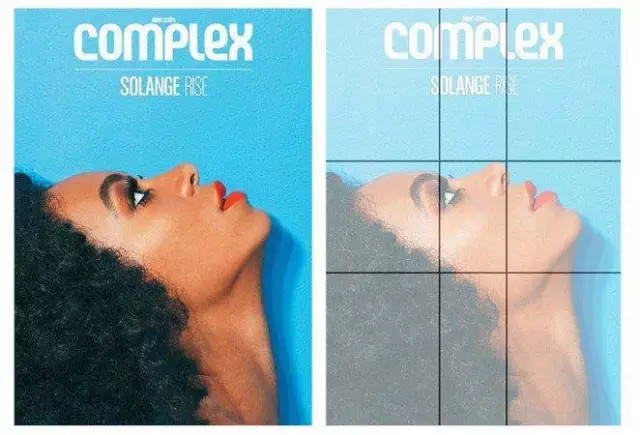 这个是《Complex》的封面,歌手Solange Knowles担当模特,它同样使用黄金比例来确定正负空间的比例。Solange 的鼻子和前额位于三分水平线最顶端一条,鼻子和眼睛则分别落在两条垂直线上,这里刚好是矩形中心。