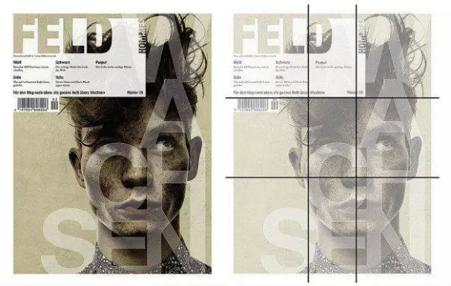 《Feld》的这张封面将模特对称的眼睛作为黄金比例的重心。这张封面看起来相当不错,因为模特偏离了画面中心,而且他的脸几乎与左侧阅读指南垂直。