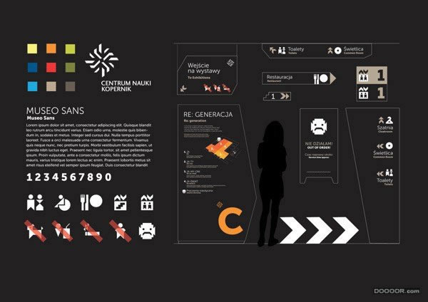 The wayfinding system of the Copernicus Science Center in Warsaw was designed to highlight the building’s architecture and surroundings in a subtle, but clear manner. Mamastudio’s goal was to create a unique visual system using the characteristic form of the building as inspiration. Irregular forms visible on architectural plans are repeated in the shapes of information modules, signs and icons. The applied typography repeats the shapes and rhythm of the icons to ensure further consistency. Visual associations with the museum are additionally enhanced by the use of colors already present in the institution’s identification system.