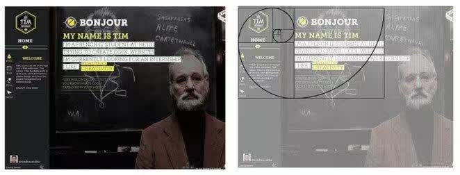 下面这个网站由平面设计师 Tim Roussilhe 为 自己设计。它的内容虽看起来非常密集,但它的排版也遵循黄金比例和黄金螺旋规律,它的重点是文本的左上部分的网站。我们的视线首先会落在顶端“你好,我的 名字叫提姆”这个位置,慢慢地,会向Tim的工作内容转移,然后看到一个菜单按钮,进而发现左上角的一个图标,在视线到达这个设计的“消极区域”前,我们 已经接收完所有它需要告诉我们的信息了。