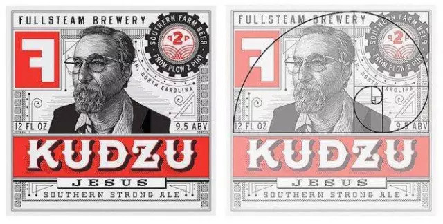 Helms Workshop 工作室为Fullsteam啤酒厂设计了这个品牌,他使用黄金比例和黄金螺旋处理布局和内容。设计中的各种元素在每个独立的正方形中都显得非常和谐,视线的 重点也正好落在主人公、邮票、酒精含量和厂址上。当我们看到这张标签时,通过黄金比例构图让我们 注意到其中的内容,进而让我们了解创始人和品牌故事的细节。
