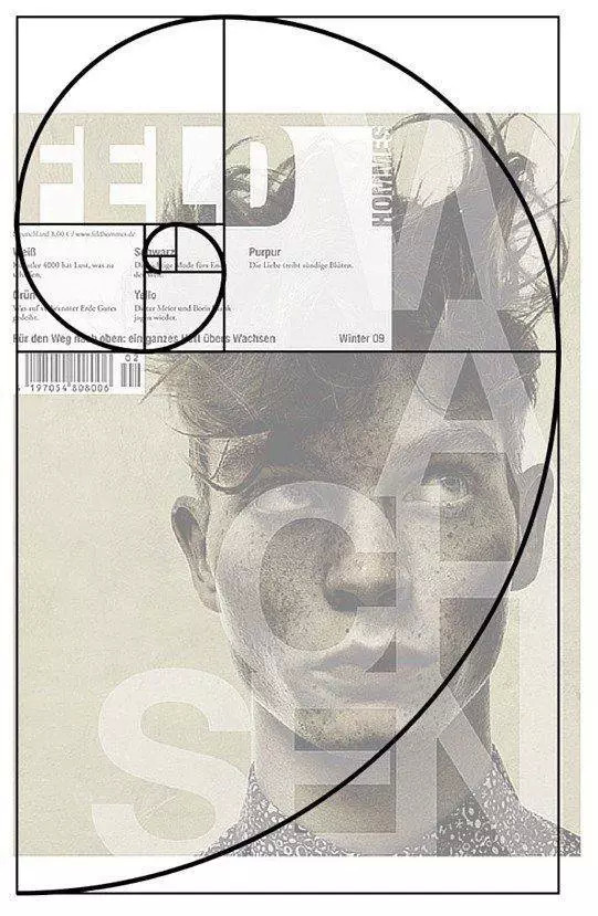 《Feld》的这张封面将模特对称的眼睛作为黄金比例的重心。这张封面看起来相当不错,因为模特偏离了画面中心,而且他的脸几乎与左侧阅读指南垂直。