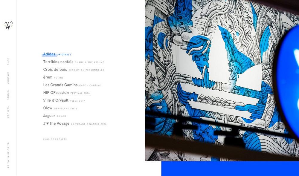 The Feebles 这个网站当中,设计不仅借用手绘来展示他的设计过程,而且网站本身还采用了许多手绘元素,比如左上角的LOGO。