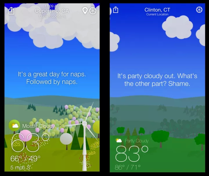 在你的界面当中加入更加触动人心的文案。无论是成段的文本,还是界面元素里的微文案,都可以通过更有触动性的文本来创造对话的感觉。就像 WTFWeather 这个应用一样,从文本到标签都采用的是对话式的表达,在为用户推送信息的时候也尽量营造出对话的感觉。